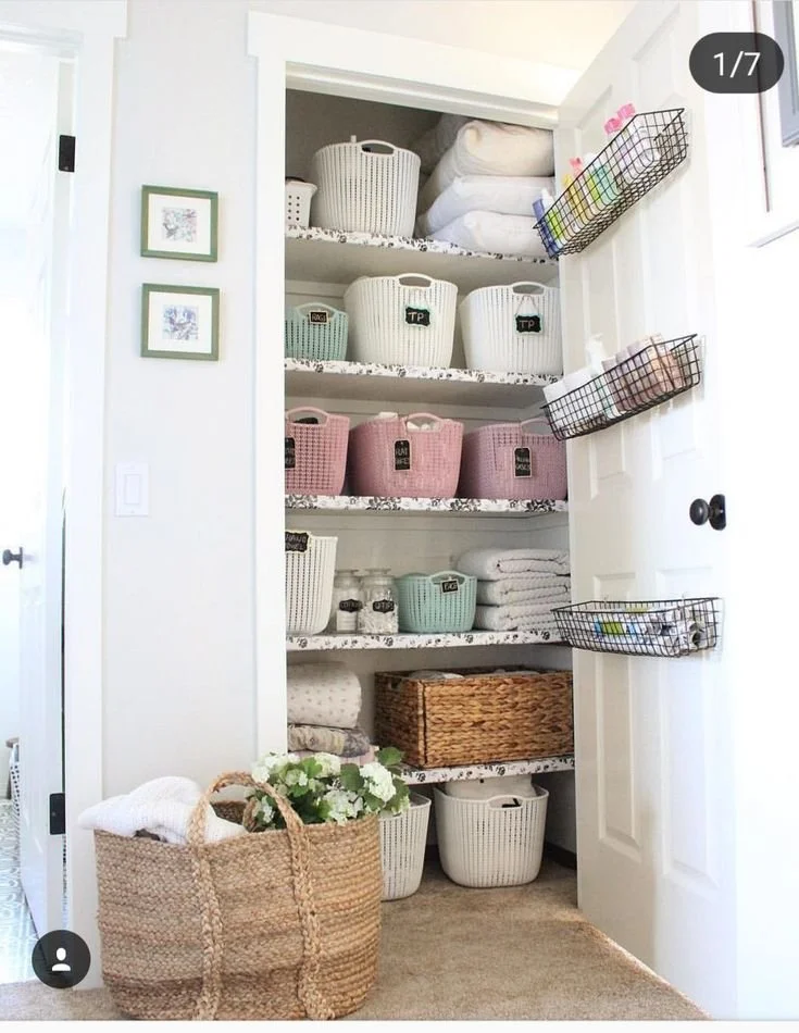 Not everything in a linen closet needs to be hidden away. A balance of open shelves for neatly folded towels and closed baskets for odds and ends creates both beauty and function. This mix lets you show off your prettiest linens while keeping less aesthetic items tucked away.