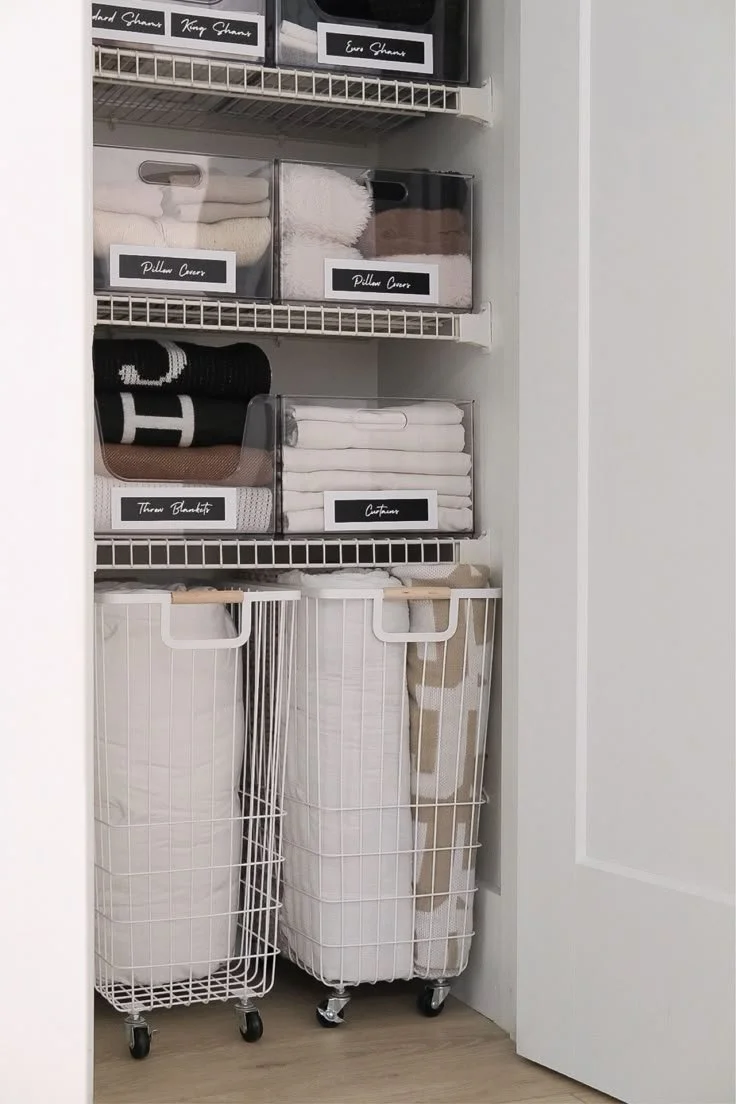 Keep your linen closet both beautiful and functional by mixing rolling hampers for laundry and lidded bins for linens. The hamper makes laundry transport easy, while the bins give your towels, sheets, and bedding a uniform, hotel-style look.