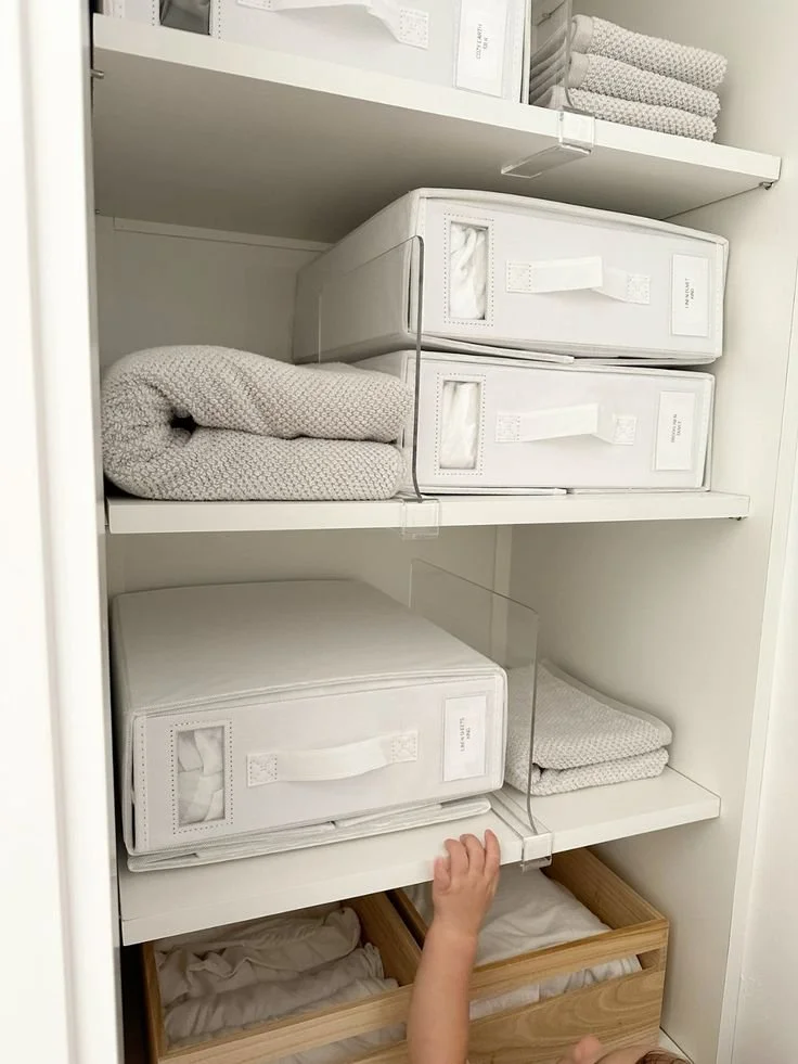 Clear bins with labels are the easiest way to bring order to a linen closet. By separating your items into categories—like towels, sheets, extra bedding, or guest supplies—you’ll always know where everything belongs. The bins keep stacks from toppling over, while labels make it simple for anyone in the family to put things back in the right place.