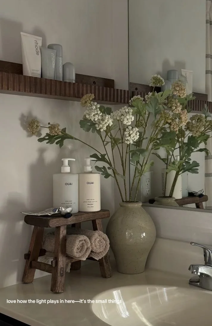 I love using wood accents in the bathroom because they are so versatile. You can juxtapose that with something soft like a faux peony arrangement to brighten and soften up the look.