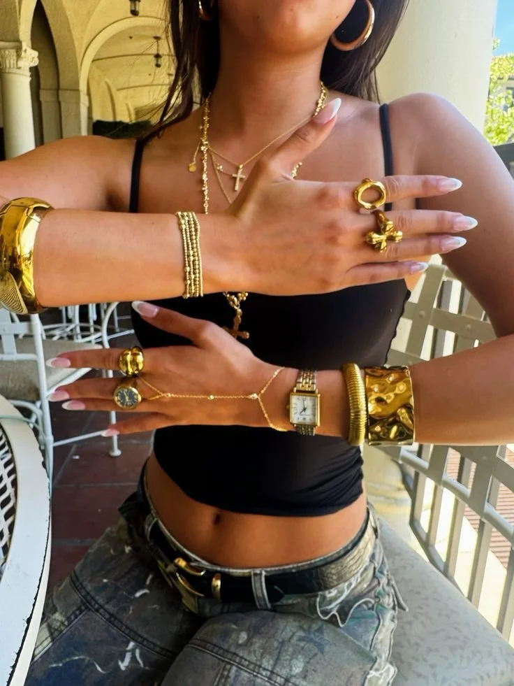 Layered jewelry, dramatic sunglasses, and bold prints.