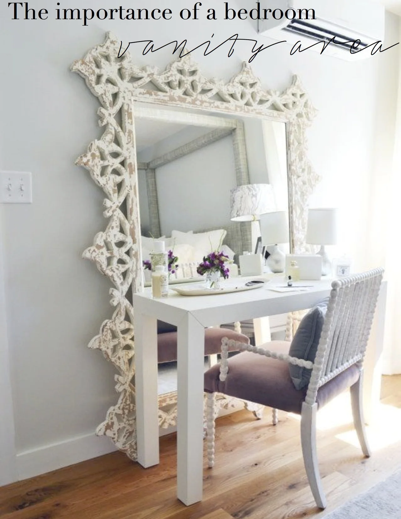 The other day I got an email from a very sweet girl. She, like me, loves interior decor and felt like her home needed a little bit more of "her" in it. She lives at home with her parents and siblings and they have a totally different style than she does, not to mention she shares her room with her little sister. She asked me what she could do, decor-wise, to make the space feel like her own. In my newsletters, I always talk about the importance of domestic bliss and creating a space that nurtures and supports you to be the best version of yourself. So, my advice to this sweet young decorista. . .create a vanity area in your room.
